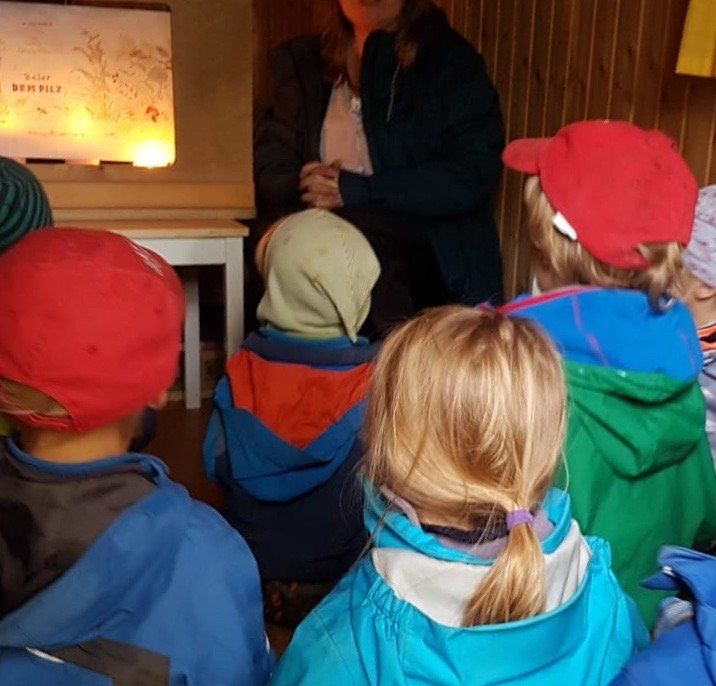 Hereinspaziert !! Im neuen Bauwagen ist Drehkino-Zeit ! Jedes Kind bekam im Morgenkreis eine Eintrittskarte und die herzliche Einladung nach dem Frühstück Platz zu nehmen im Drehkino. Ein selbstgebauter Holzrahmen, zwei Kurbelrollen, eine Geschichte auf Pergament gezeichnet und Kerzenlicht; das sind die Zutaten für dieses feine, kleine Kino. Gespannt schauen die Kinder auf die Geschichte vom kleinen Pilz, der auf wundersame Weise erst nur einer Ameise und später sogar noch vier anderen Tieren Schutz bietet vor dem Regen.
